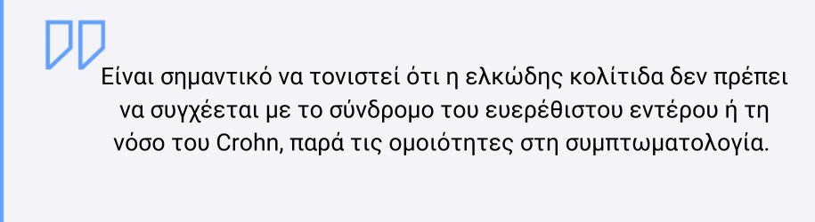 Είναι σημαντικό να τονιστεί ότι η ελκώδης κολίτιδα δεν πρέπει να συγχέεται με το σύνδρομο του ευερέθιστου εντέρου ή τη νόσο του Crohn, παρά τις ομοιότητες στη συμπτωματολογία.
